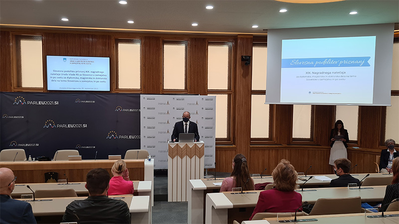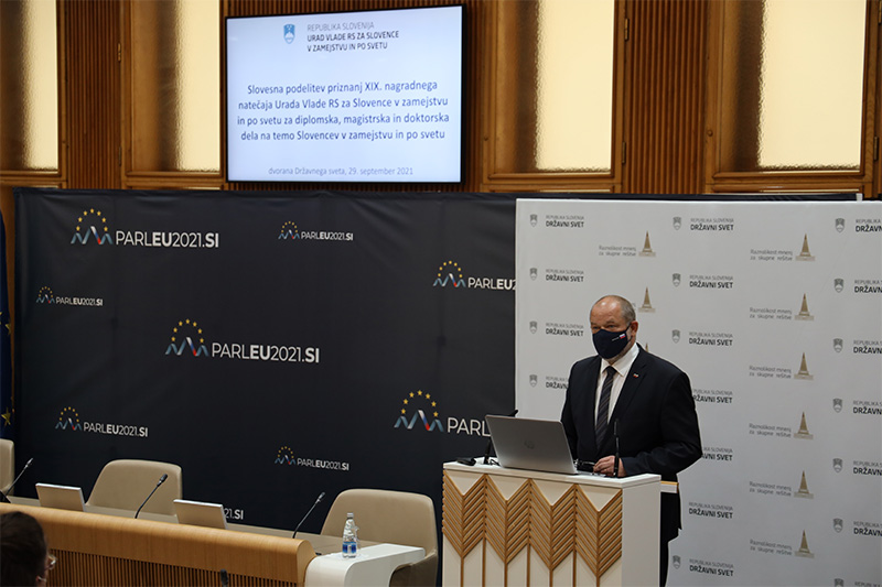 V dvorani Državnega sveta RS je bila v sredo, 29. septembra 2021, slovesna podelitev priznanj XIX. nagradnega natečaja Urada Vlade RS za Slovence v zamejstvu in po svetu za diplomska, magistrska in doktorska dela na temo Slovencev v zamejstvu in po svetu. Zbrane sta nagovorila predsednik Državnega sveta Alojz Kovšca in ministrica za Slovence v zamejstvu in po svetu dr. Helena Jaklitsch.