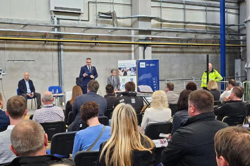 Logatec, 8. april 2024 - Predsednik Državnega sveta Marko Lotrič se je udeležil srečanja podjetnikov industrijsko-obrtnih con v Logatcu, ki ga je v požarnem laboratoriju Zavoda za gradbeništvo Slovenije gostil župan Občine Logatec Berto Menard. Ob tej priložnosti je predsednik DS zbrane tudi nagovoril.