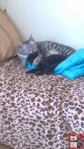 "Odkar imamo Aško (prej Kali), naša Bobika nima več časa praskat pohištva in nagajat psu. Prelevila se je v mačjo mamo in vse, kar ve in zna, prenaša na tamalo. Aška jo obožuje, neumorno se igrata in objemata. Mogoče Bobi pretirava z umivanjem Aške, saj ne neha, dokler ni čisto mokra. Ne uspemo ji dopovedati, da črne barve ne bo mogla umiti z nje