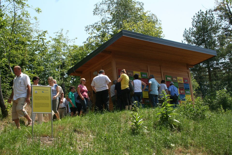 Učni čebelnjak se nahaja za stavbo in je arhitekturno kopija Čebelarskega centra Gorenjske.