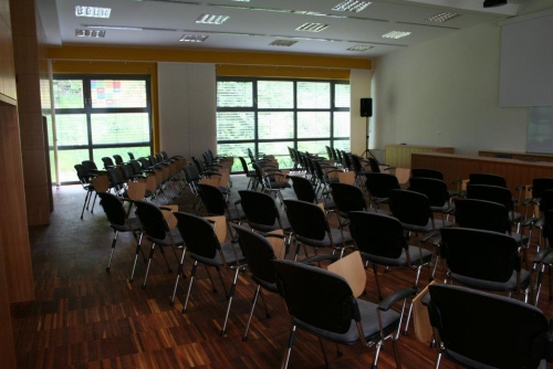 Dvorana - predavalnica je sodobno opremljena in ima 100 sedežev.