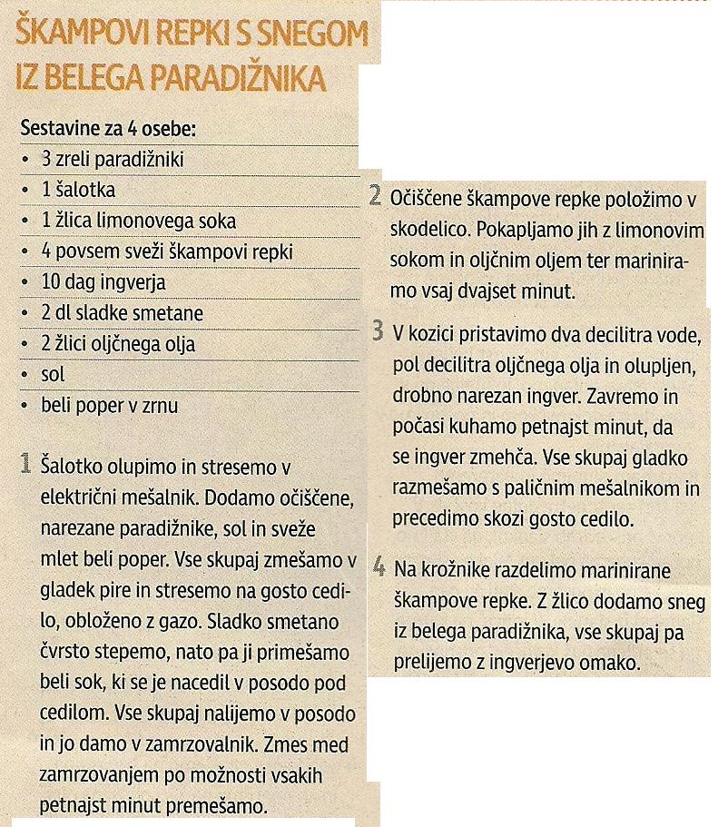 Škampovi repki s snegom iz belega paradižnika