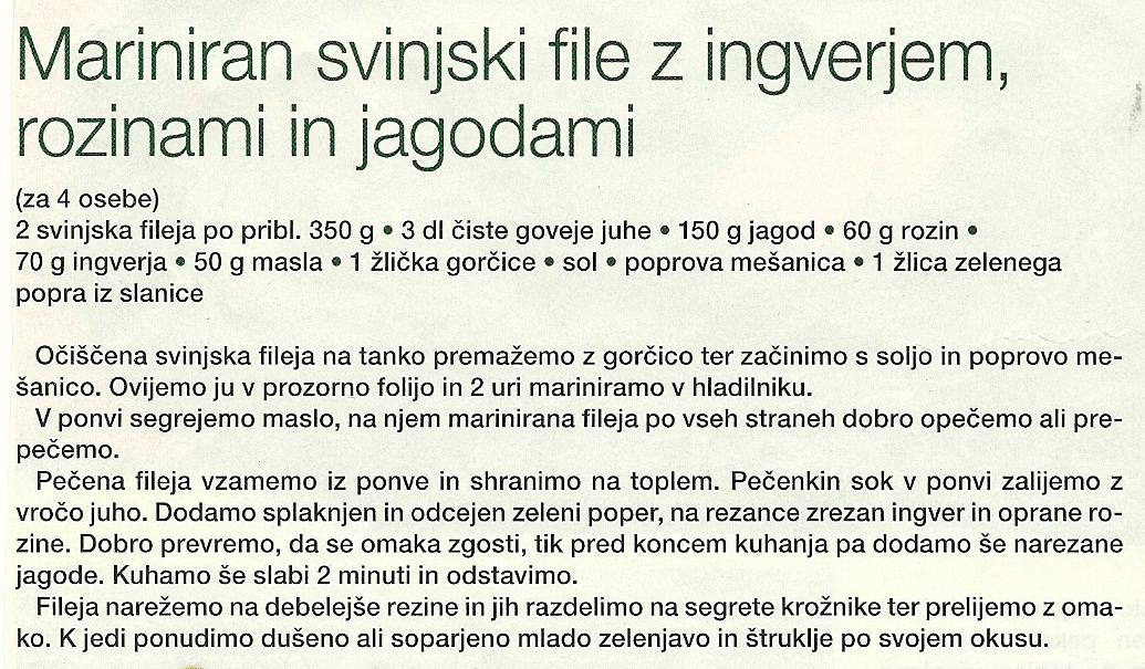 Mariniran svinjski file z ingverjem, rozinami in jagodami