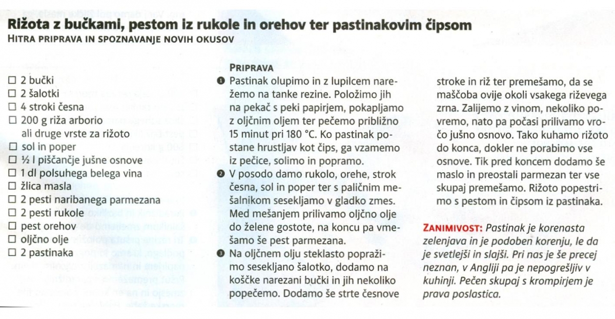 Rižota z bučkami, pestom iz rukole in orehov ter pastinakovim čipsom