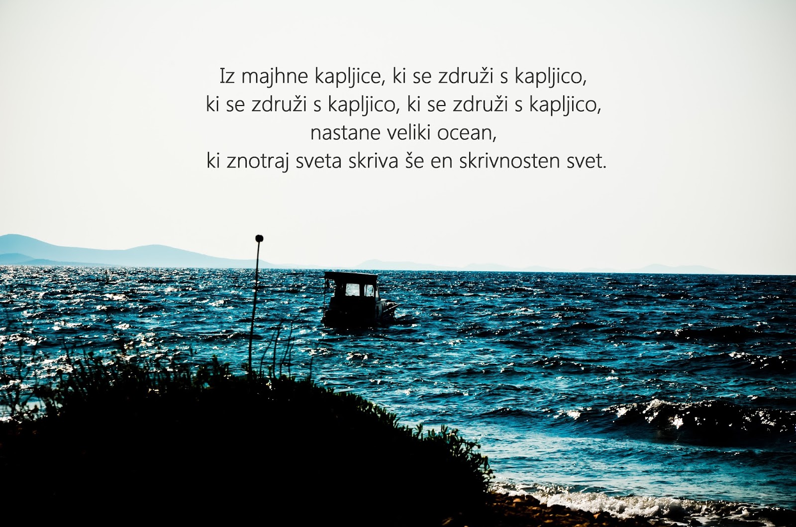 A ni tudi vsak posameznik svet zase? Skrivnosten svet, ki ga pozna samo sam? Tudi če popolnoma razkrijemo sebe drugim, še vedno se v nas nekaj skriva ali pa se spreminja. Zato ne sodite ljudi, saj jih dejansko sploh ne poznate. Poglejte se v ogledalo in začnite raziskovati sebe. Toliko lušnega še ne veste. Počasi, kapljico za kapljico, raziskujte svoj ocean. Ostala pa le opazujte od daleč, ne tiče se vas preveč. Če pa se kakšna svetova združita, pa nastaja nov skrivnosten svet, vendar še vedno imate svojega, lastnega in skrivnostega. Na tega le ne pozabite.