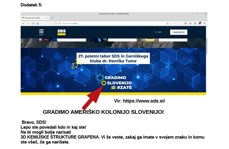 Vodja SDS, bivši direktor vlade, je svojo lojalnost ameriškim gospodarjem izkazal tudi tako, da je dal spremeniti logotip svoje stranke tako, da je v logotip dodal množico šestkotnikov, ki se držijo drug drugega z eno stranico, to pa je točno slika kemijske strukturne formule grafena. Torej se prekleto zaveda, kakšen pomen ima grafen, da je to osnova ameriške ekspanzije, in daje vedeti, da je on veliki pristaš tega. S tem se očitno celo potihem hvali in obljublja zvestobo svojemu US-gospodarju, zavojevalcu sveta kot njegov zvesti izvrševalec na ozemlju Slovenije.