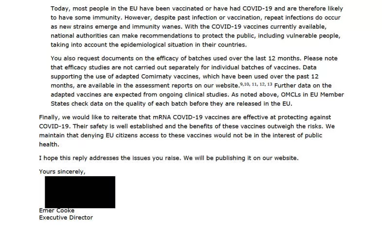 In your initial letter you called for the immediate suspension of the marketing authorisations of Comirnaty and Spikevax. In our reply, we explained the basis of the authorisation of these vaccines and why any such suspension would be a great disservice to public health.