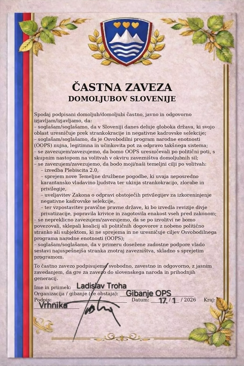 Ker nobena politična stranka v Sloveniji — kljub večkratnim povabilom, posvetu v Žalcu 17. januarja 2026 in javnemu pozivu 19. januarja 2026 — ni bila pripravljena prevzeti odgovornosti in se zavezati ljudstvu za izvedbo Osvobodilnega programa narodne enotnosti (OOPS), to zgodovinsko odgovornost prevzemamo mi.