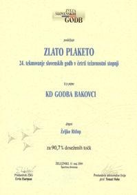 Da smo na pravi poti k izboljševanju kakovosti izvajanja skladb, dokazuje tudi zlata plaketa v četrti težavnostni skupini, ki je tudi prvi velik dosežek. Na tekmovanju v Železnikih na Gorenjskem leta 2004 smo se z dvema skladbama predstavili štiričlanski mednarodni ocenjevalni žiriji in dosegli 90,7 točke.