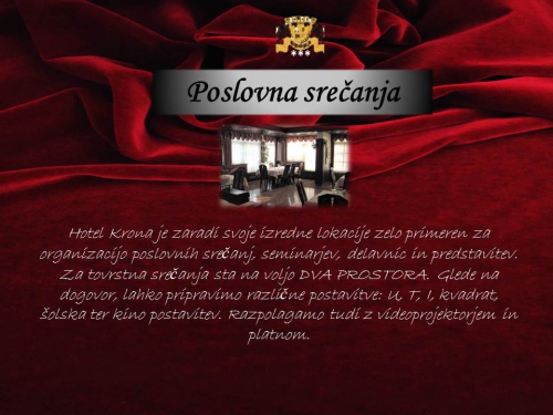 Hotel Krona je zaradi svoje izredne lokacije zelo primeren za organizacijo poslovnih srečanj, seminarjev, delavnic in predstavitev.
