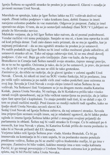 Ekipa Uroša Novaka, ki je pred leti zavzela legendarni ljubljanski lokal K4, pa naj bi politično stranko potrebovala za svoje poslovne načrte. Od Šoltesa tudi izrecno zahtevajo, da mora nastopiti na parlamentarnih volitvah,