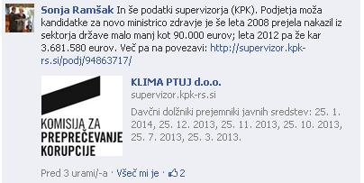 Sonja Ramšak: In še podatki supervizorja (KPK). Podjetja moža kandidatke za novo ministrico zdravje je še leta 2008 prejela nakazil iz sektorja države malo manj kot 90.000 eurov; leta 2012 pa že kar 3.681.580 eurov. Več pa na povezavi: http://supervizor.kpk-rs.si/podj/94863717/