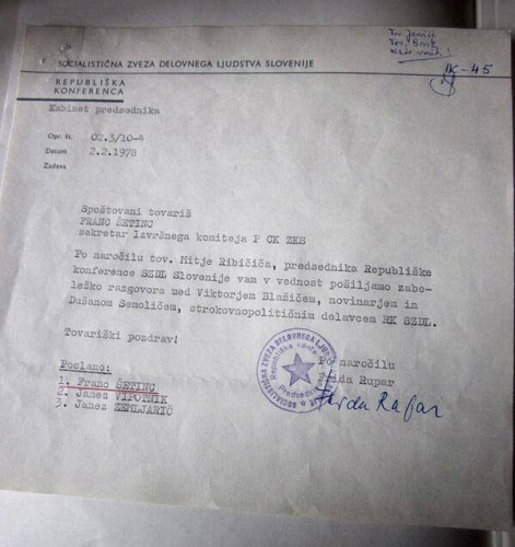Po naročilu tov. Mitje Ribičiča, predsednika Republiške konference SZDL Slovenije vam v vednost pošiljamo zabeležko razgovora med Viktorjem Blažičem, novinarjem in Dušanom Semoličem, strokovnopolitičnim delavcem RK SZDL.