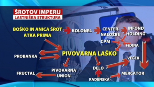 Mreža podjetij, ki so »prevzemala« pivovarja (za vsemi je lastniško stal Boško Šrot) je izjemno zapletena in predmet več preiskav, ki bodo epilog dočakale na sodišču. Šlo je takole: Šrot je bil 50-odstotni lastnik Atke Prima d.o.o., ta pa je bila 100-odstotna lastnica družbe Kolonel d.o.o. (pozneje se je družba preoblikovala v d.d.). Ta je z 78-odstotnim deležem obvladoval družbo Center Naložbe d.d., ki je bila 71-odstotni lastnik družbe Infond holding d.d., ta pa okoli 53-odstotna lastnica Pivovarne Laško d.d.