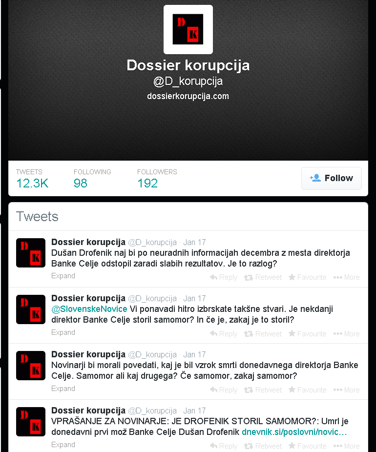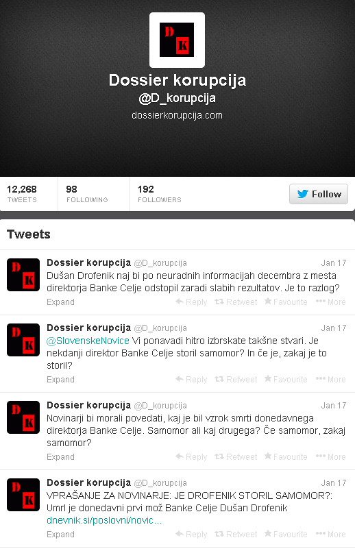 Če vtipkate v gooogle te besede: direktor banke celje storil samomor ne boste našli nič, razen na strani, ki je kar na vrhu google zadetkov, to je Dossier korupcija na Twitterju, ki sprašuje Slovenske novice, delno namiguje, da bi direktor Banke Celje, Dušan Drofenik storil samomor.