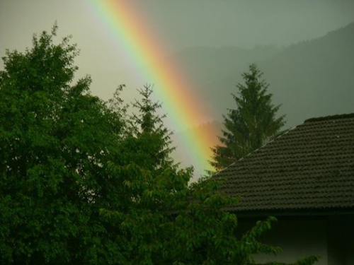 Kaj neki botruje temu pojavu. V dveh dneh je to že drugič. Zelo podobne so si slike. V naravi to zgleda tako, kot bi v Cerknem gorel strašanski kres, na drugi strani mavrice pa je skoraj tema.