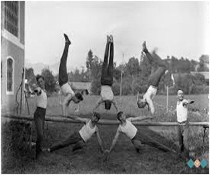 Op.: "ORLI", mladi fantje - izvajajo telovaddno prikazno vajo, leta 1910, v Komeendi. Citatni, nekomercialni preposnetek - z interneta