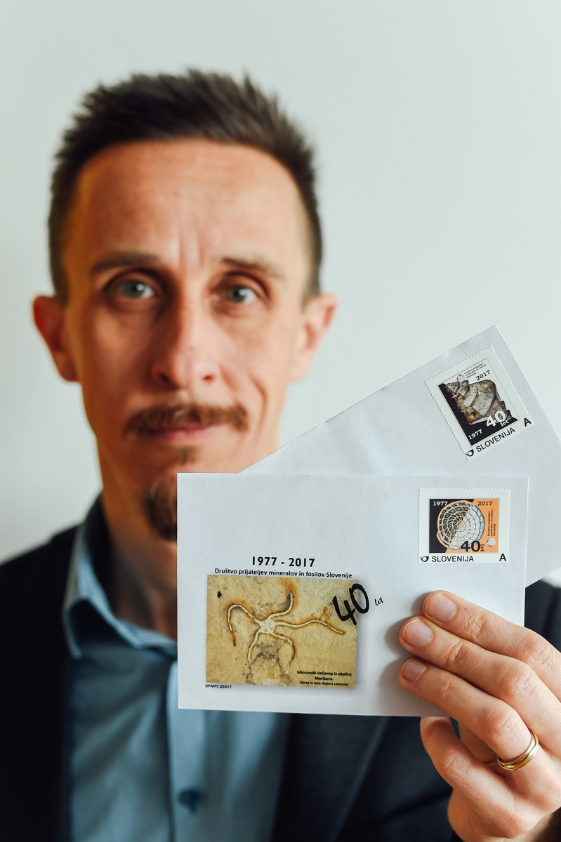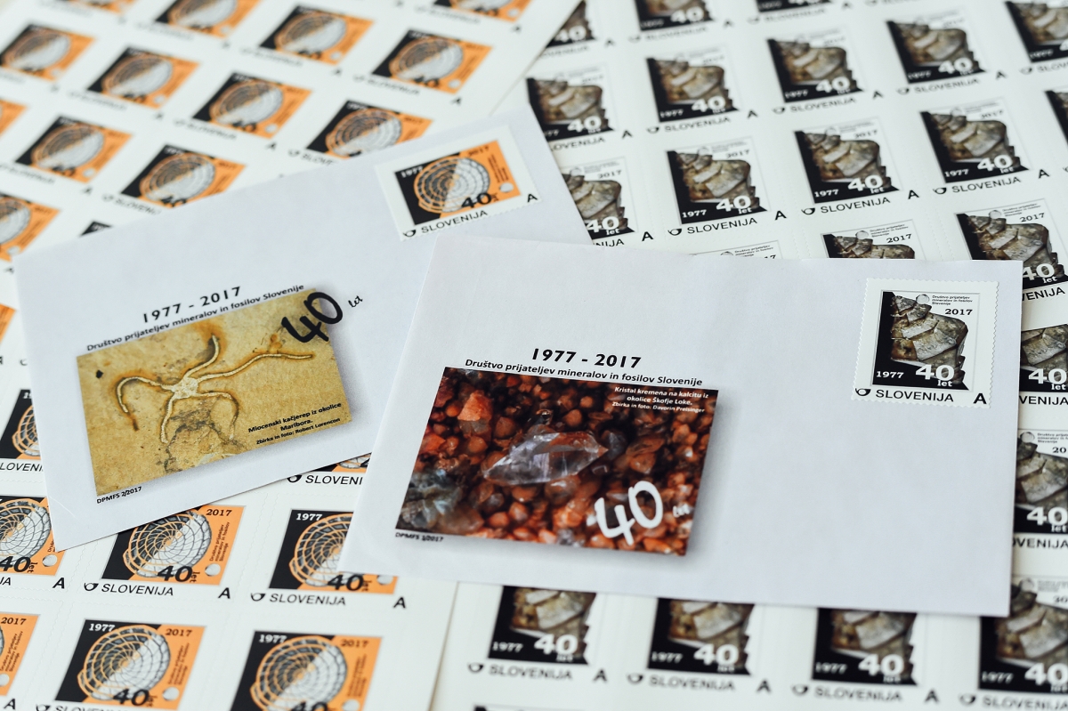 Društvo prijateljev mineralov in fosilov Slovenije je v počastitev svoje 40-letnice delovanja izdalo dve osebni spominski znamki in spominski ovojnici. Na znamkah sta predstavljena permski fosil, luknjičarka Schwagerina iz Dovžanove soteske pri Tržiču in lep kristal kremena iz Logatca. Na ovojnicah pa so prav tako prikazani kristali kremena in miocenski fosilni kačjerep. Izdaja spominskih znamk sovpada z začetkom mednarodnega sejma zbirateljstva Collecta, ki se ta petek, 17. marca, začne na Gospodarskem razstavišču v Ljubljani.