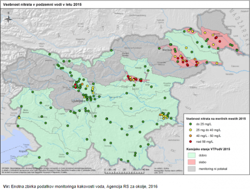 Z nitrati je najbolj obremenjena voda na področju severovzhodne Slovenije ( Vir: Agencija RS za okolje). Najbolj obremenjena vodna telesa so Savinjska kotlina, Dravska kotlina in Murska kotlina. Med večje kraje štejemo: Murska Sobota, Beltinci, Kidričevo, Žalec, Polzela, ...