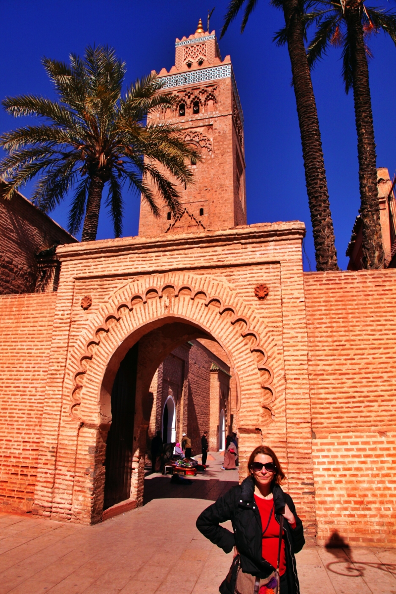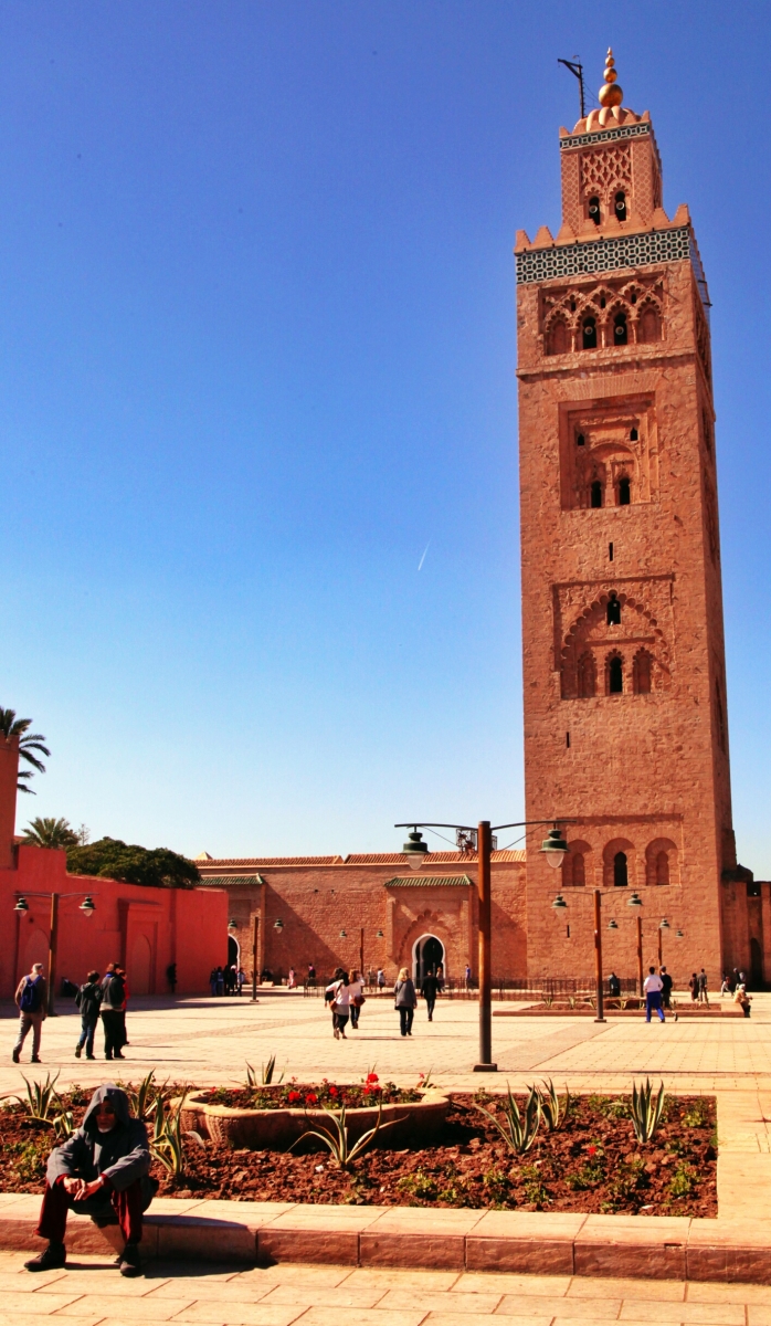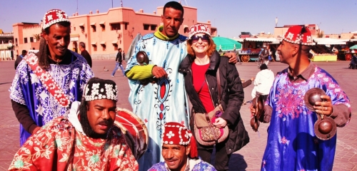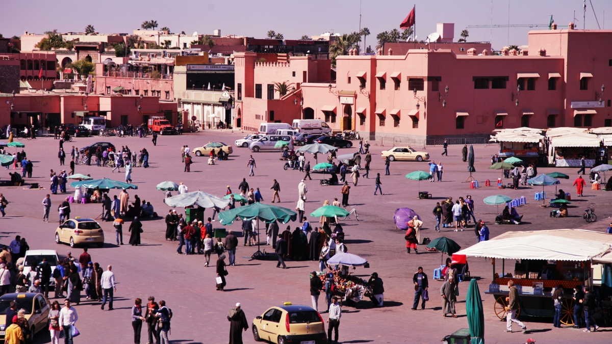 V Marakešu vse poti vodijo na ogromni trg Džema el Fna in tudi naju je naplavilo na njegov rob. Hotel Cecil, ki je tukaj že od leta 1929, deluje temu primerno kolonialno, hkrati pa dovolj lokalno in predvsem žepu prijazno za lagodno parkiranje nahrbtnikov. Ko se ob palmi, vladarici notranjega dvorišča, povzpneš na teraso, dobiš vse, kar si v Marakešu lahko zaželiš: odličen razgled na trg in mir, ki ga začneš krvavo ceniti že po petih minutah. Tukaj so turisti pač alfa in omega lokalne ekonomije in ne glede na to, ali hodiš v strgani majici ali v Armaniju, ti pripada status denarnice na dveh nogah. Prodajalci, vodiči, lastniki kafičev in restavracij, ponudniki izletov v Saharo in tetovaž s heno, pa seveda ulični nastopači vseh profilov prežijo na vsakem koraku in se ne pustijo odgnati s preprostim ne. Za razliko od Fesa in zlasti Meknesa tudi niso zadovoljni z malim, pa tudi na drobiž radi pozabijo. Tako sva po tistem, ko sva precej na tesno prišla skozi souk, pobegnila na svež zrak terase, kjer končno uživava v temeljnem motivu najine poti - soncu in dvajset in nekaj stopinjah. Ah, dragi moji, za to pa se že splača odriniti kakšen dirham več. Mislim, da bova ure modrega neba dodobra izkoristila.