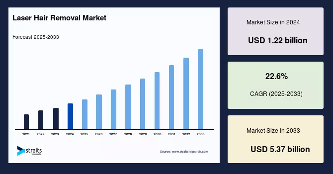 According to StraitsResearch, the global laser hair removal market size was valued at USD 1.22 billion in 2024 and is estimated to reach USD 5.37 billion by 2033, growing at a CAGR of 22.6% during 2025-2033.