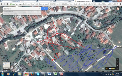 Modro so poplavljeni travniki in vrtovi, ki v tolikšnem obsegu še niso bili. Prav tako, če so bili popljavljeni je voda stala, ne pa tekla s skoraj deročim tokom. Kjer je mogla, si je voda našla najkrajšo pot čez dvorišča (puščice od modre barve). Kje točno je ta voda "ušla" iz struge ne vem. Vendar je bila voda v strugi še vedno tako velika, da je tekla po cesti (puščica od struge, katera pelje po cesti). Tako visoka voda še ni bila, da bi tekla po cesti. Ko sta se oba tokova združila, sta ovirala eden drugega in tako se je nivo vode še večal in poplavljal tudi tam, kamor voda ponavadi ne pride in ne poplavi.