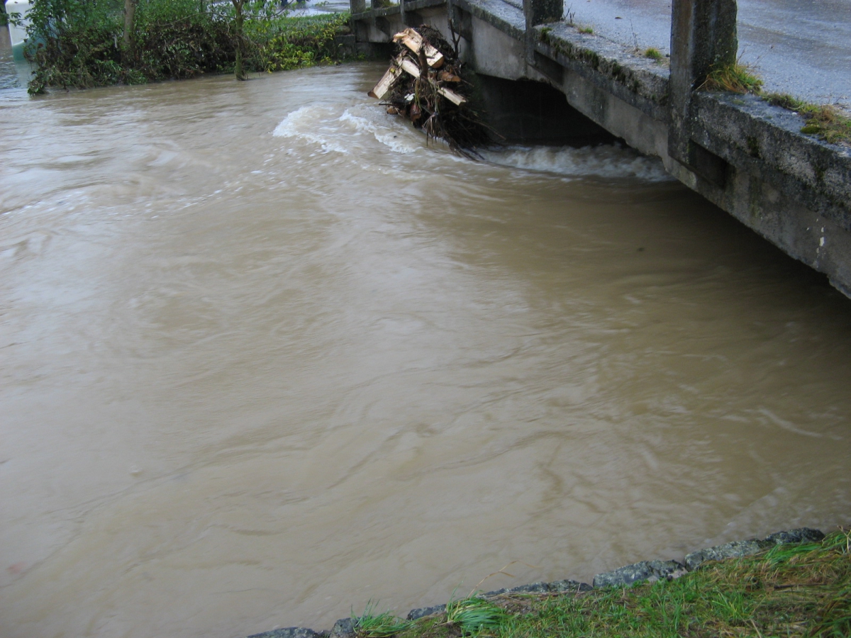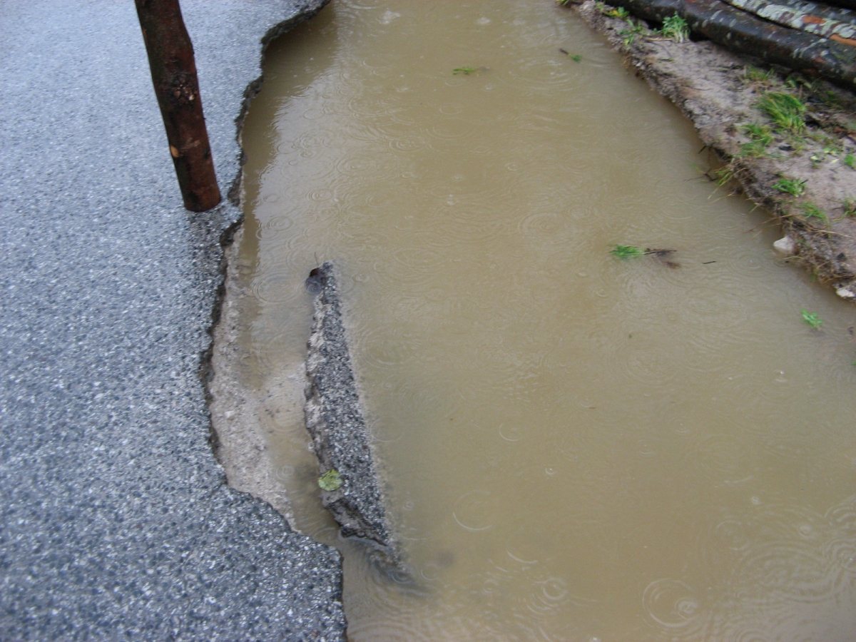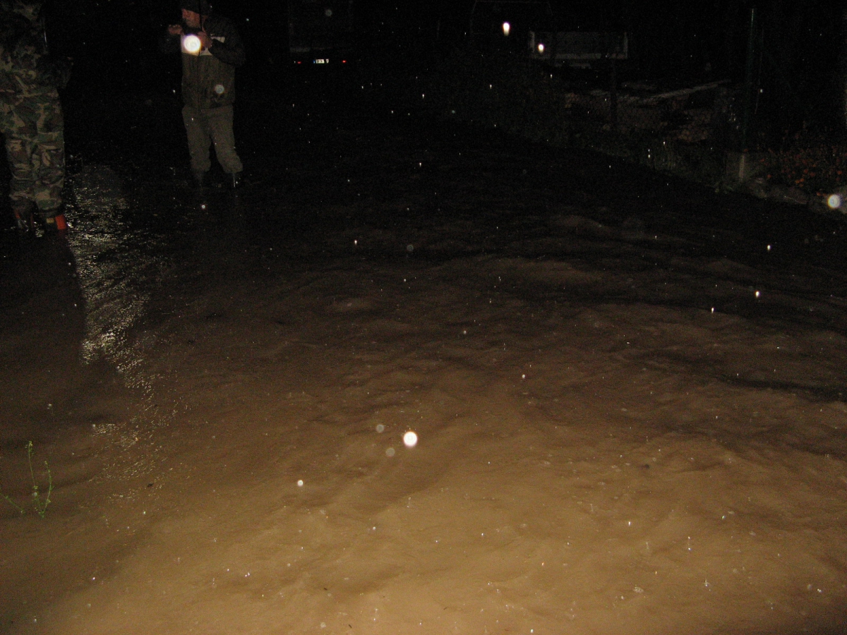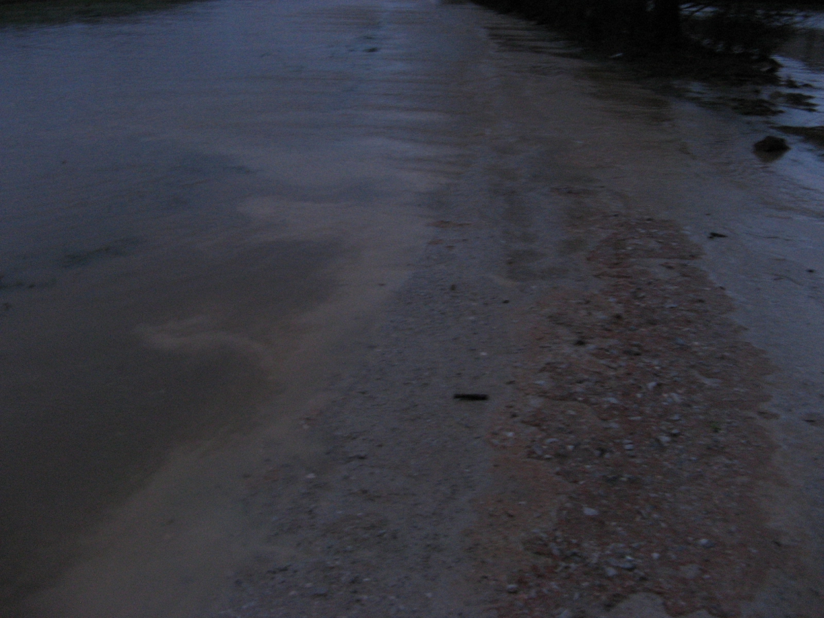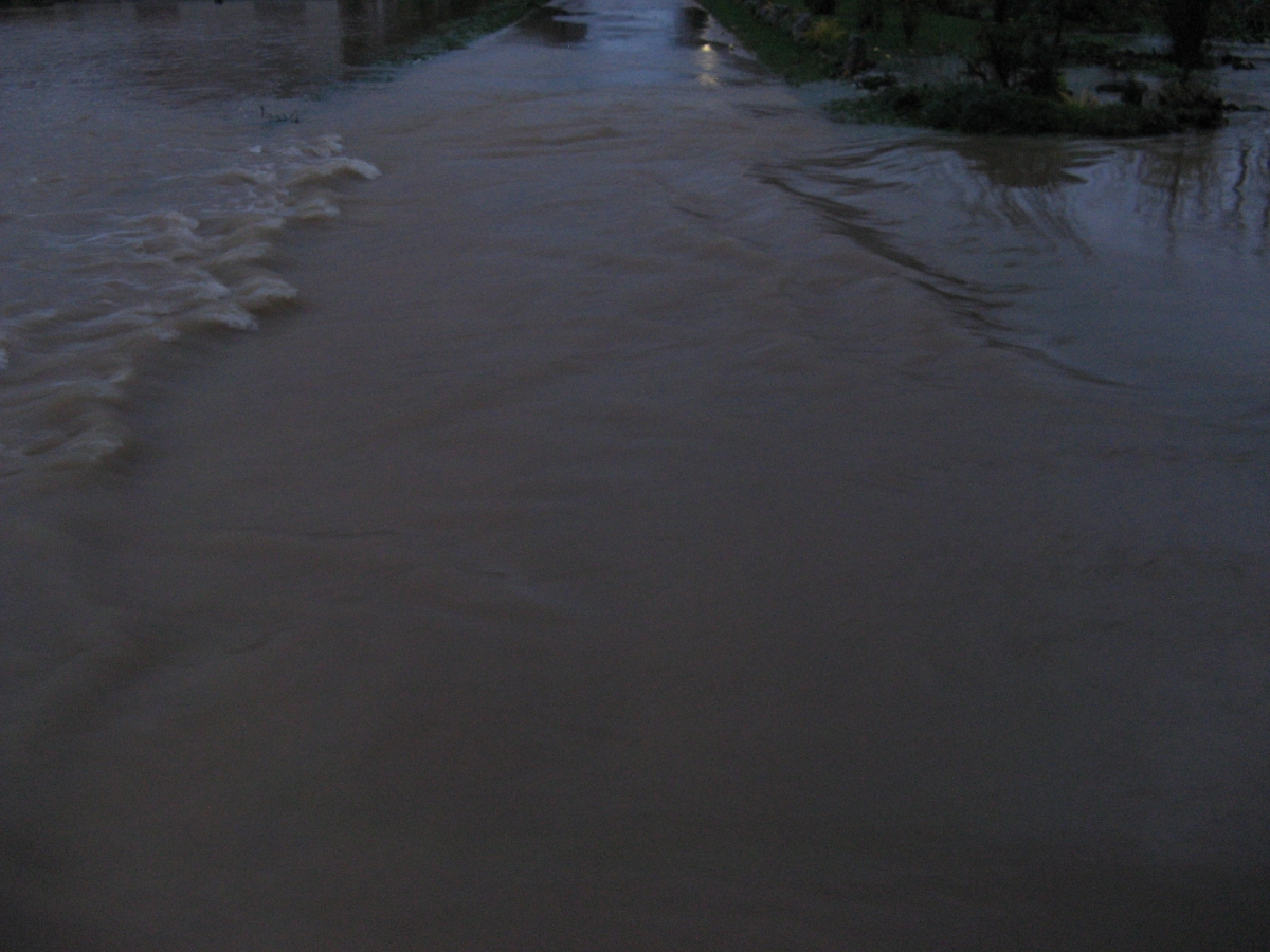 Potem se je voda počasi a vztrajno nižala in do 11h kljub stalnemu rosenju vrnila v svojo strugo. No skoraj. Na delu, med obema mostovoma je na "glavni" cesti še vedno voda. Za zvišanje gladine vode pa so krivi podporni stebri pri mostovih in brv, katero je uničilo, vendar ni odneslo in je velika ovira v potoku. Vendar imamo upanje, da se bo stanje počasi izboljšalo. Ali pa ne, saj sedaj ko pišem (13:28 močno dežuje, resnično, dobesedno lije kot iz škafa), vendar ni nujno, da se bo ta ura ujemala z uro objave, saj dodajam še nekaj fotografij dogajanja.