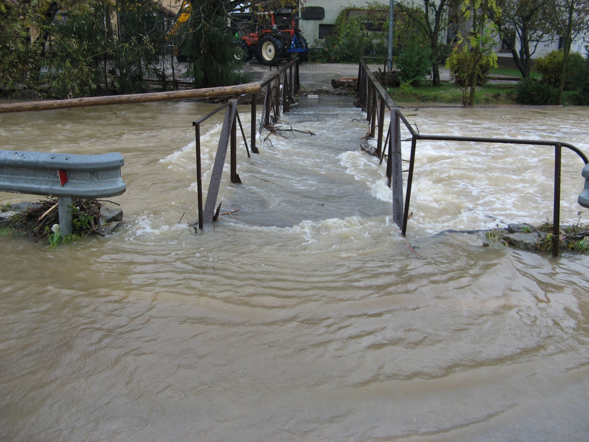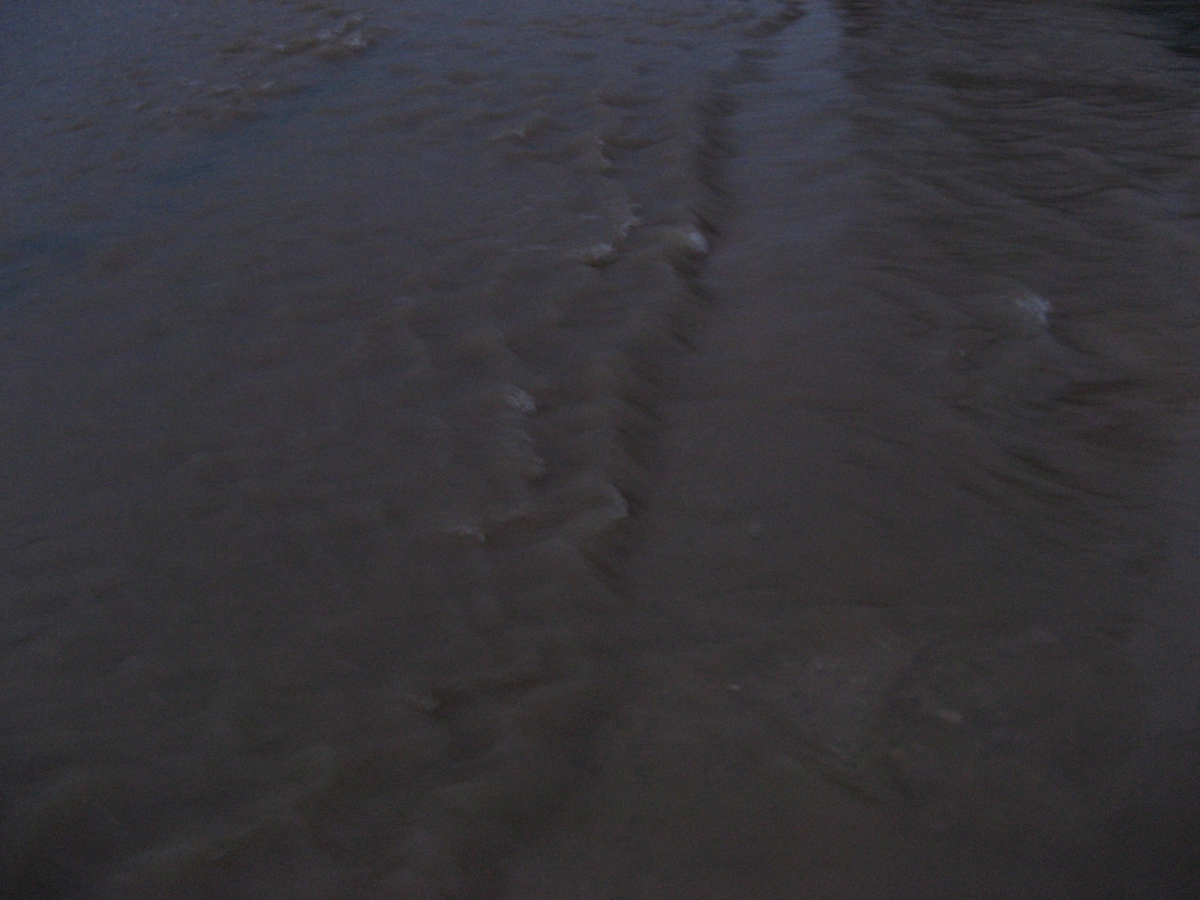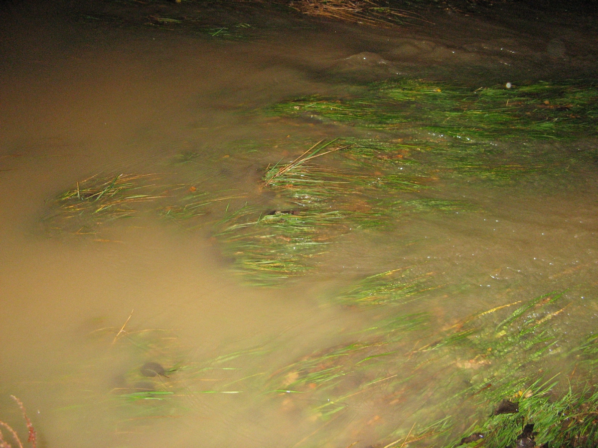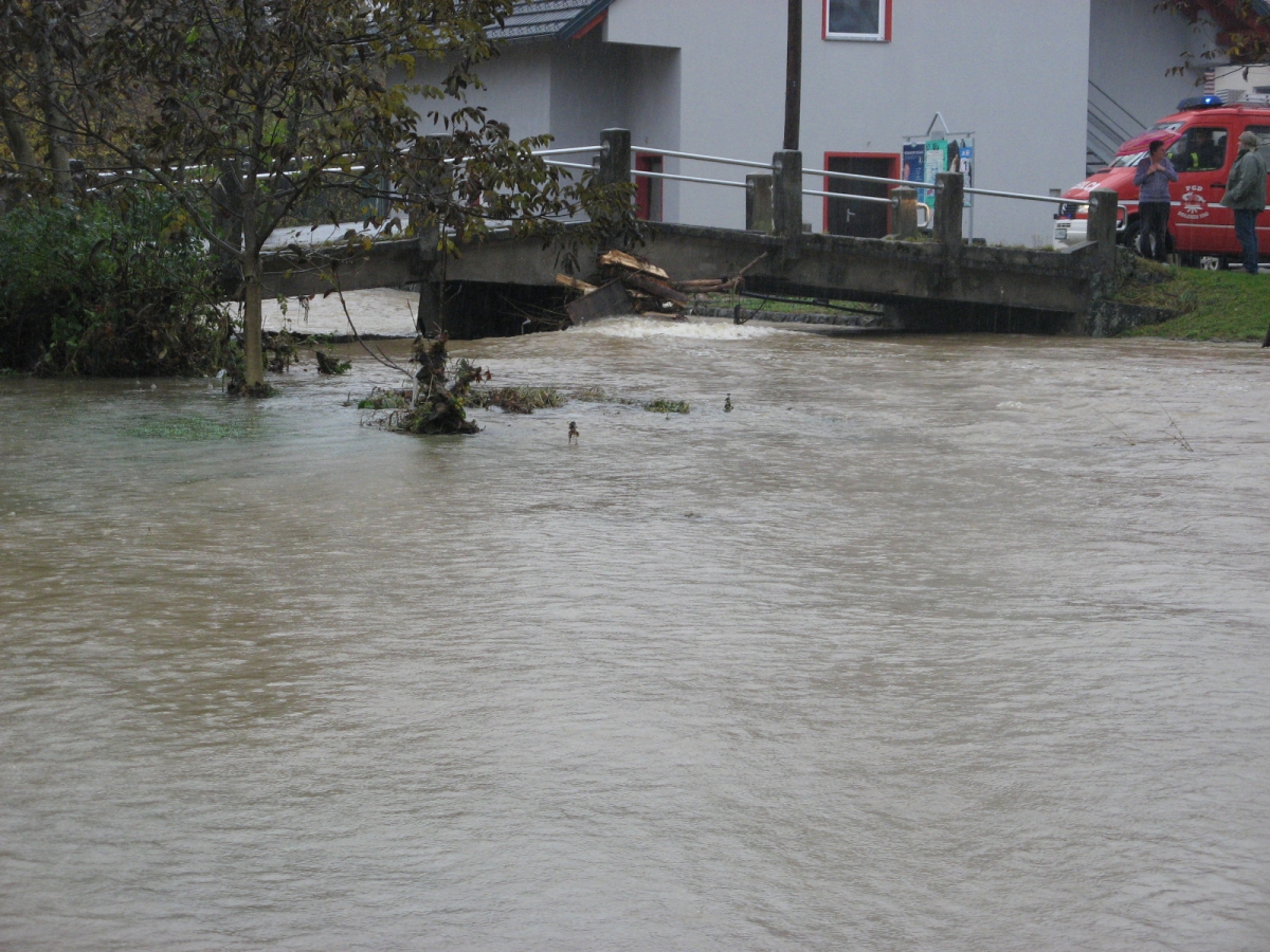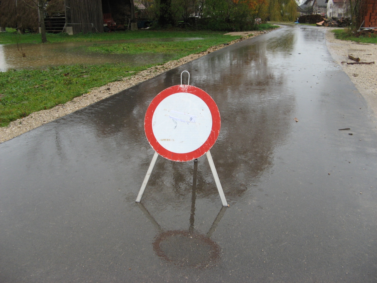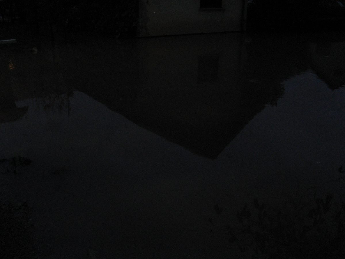 Potem se je voda počasi a vztrajno nižala in do 11h kljub stalnemu rosenju vrnila v svojo strugo. No skoraj. Na delu, med obema mostovoma je na "glavni" cesti še vedno voda. Za zvišanje gladine vode pa so krivi podporni stebri pri mostovih in brv, katero je uničilo, vendar ni odneslo in je velika ovira v potoku. Vendar imamo upanje, da se bo stanje počasi izboljšalo. Ali pa ne, saj sedaj ko pišem (13:28 močno dežuje, resnično, dobesedno lije kot iz škafa), vendar ni nujno, da se bo ta ura ujemala z uro objave, saj dodajam še nekaj fotografij dogajanja.