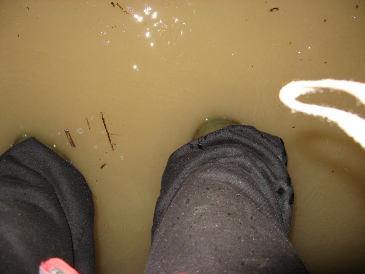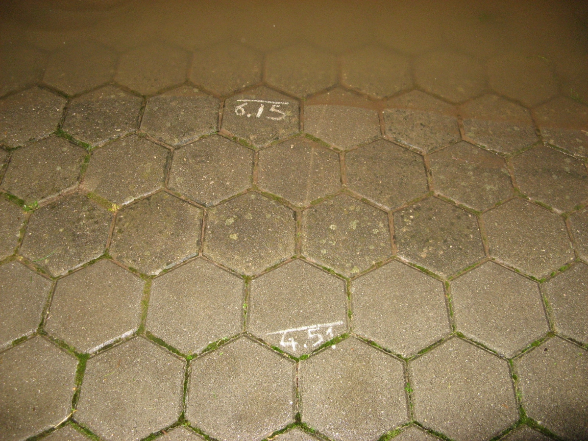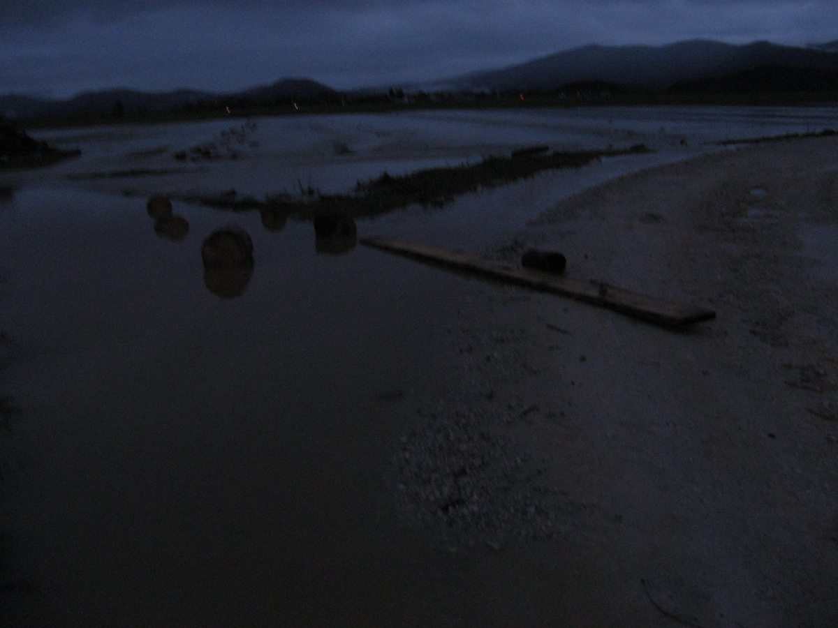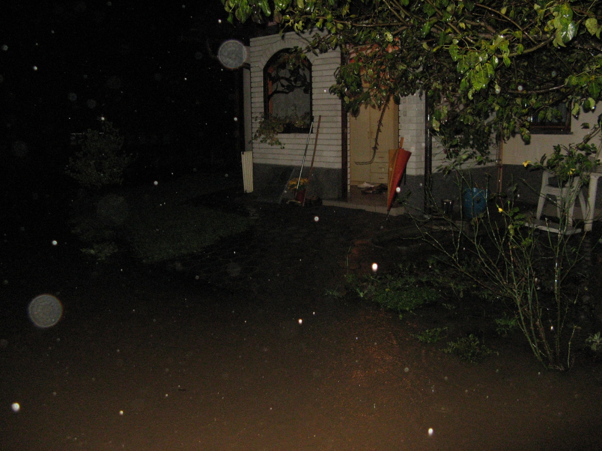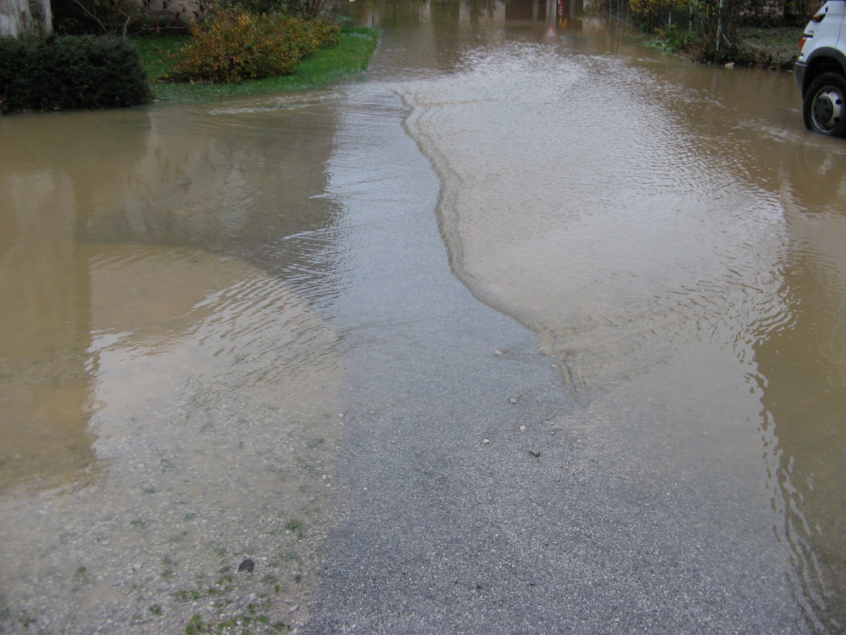 Potem se je voda počasi a vztrajno nižala in do 11h kljub stalnemu rosenju vrnila v svojo strugo. No skoraj. Na delu, med obema mostovoma je na "glavni" cesti še vedno voda. Za zvišanje gladine vode pa so krivi podporni stebri pri mostovih in brv, katero je uničilo, vendar ni odneslo in je velika ovira v potoku. Vendar imamo upanje, da se bo stanje počasi izboljšalo. Ali pa ne, saj sedaj ko pišem (13:28 močno dežuje, resnično, dobesedno lije kot iz škafa), vendar ni nujno, da se bo ta ura ujemala z uro objave, saj dodajam še nekaj fotografij dogajanja.