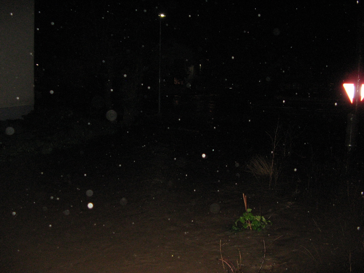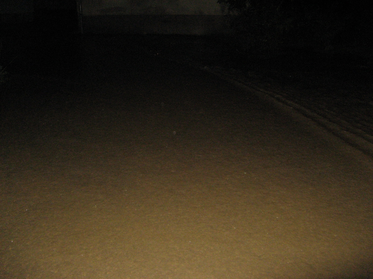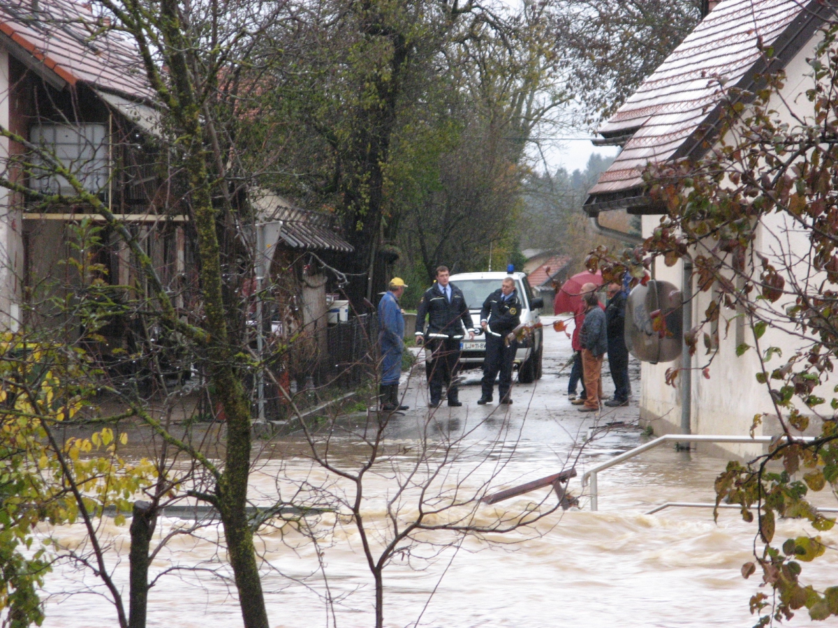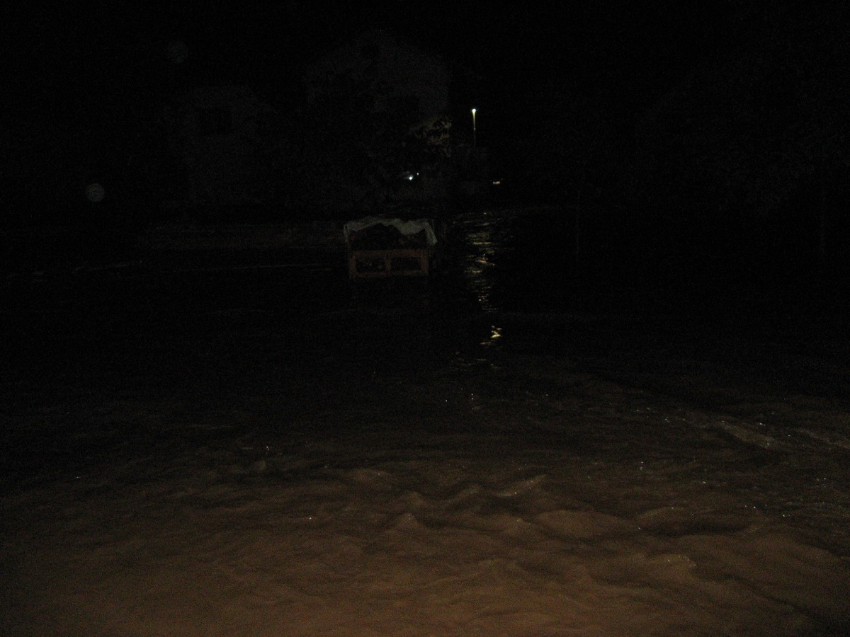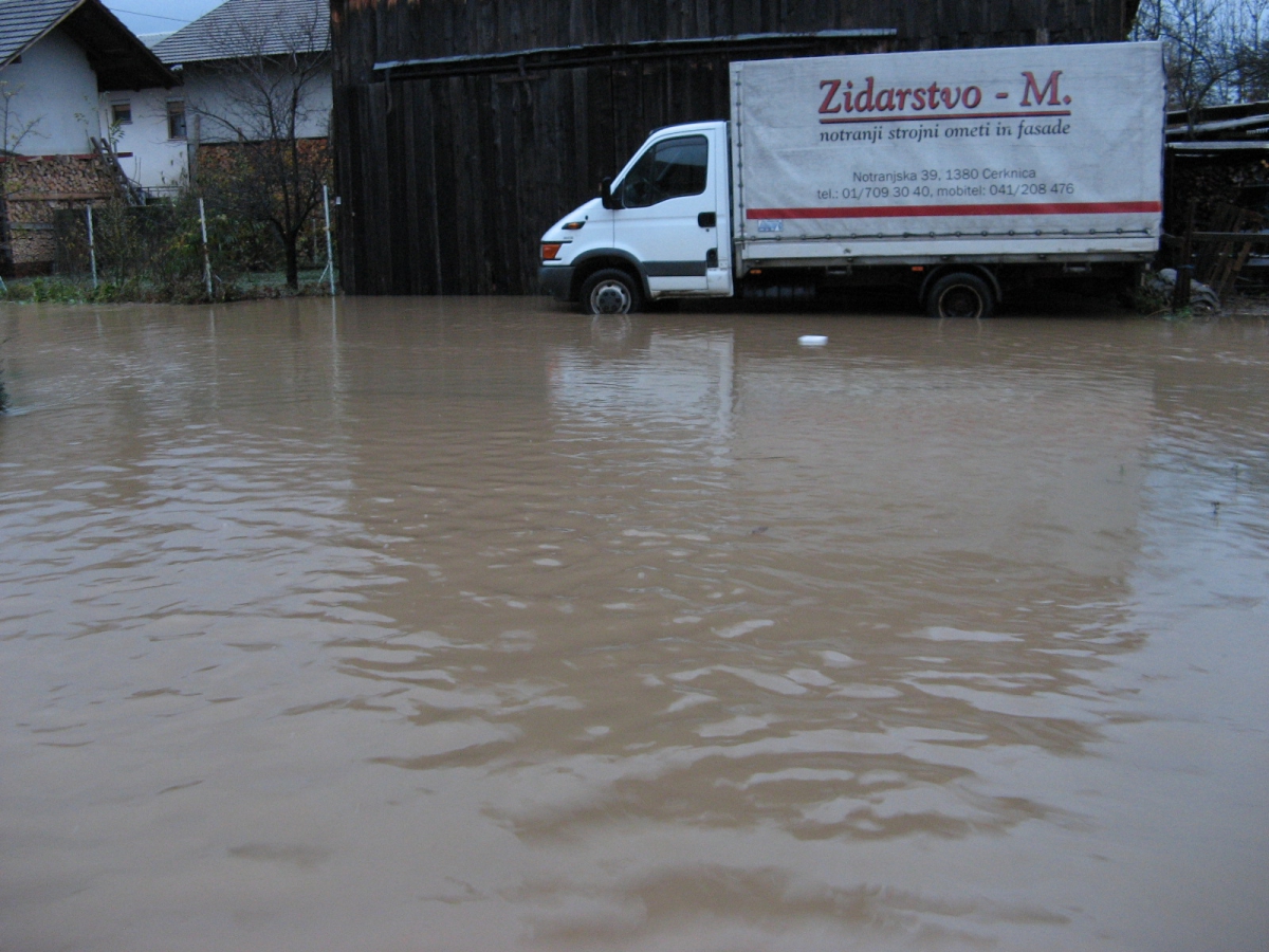 Nikjer nobenega alarma, da bi prebudil ljudi, vode je ulico stran od potoka Cerkniščice toliko, da teče po vrtovih in cesti sami. Voda je visoka in deroča. Dere, šumi. Ker nismo vedeli ali voda narašča ali pada, sem s kredo na tlakovec zarisala črto in dopisala uro. Bila je 4:51. Črta je približno 30cm nižje kot vhod v verando. Enake črte sem naredila tudi ob 6:15 in ob 7h. Prvo sireno sem slišala ob približno 5h, ko je prihajala iz Cerknice.
