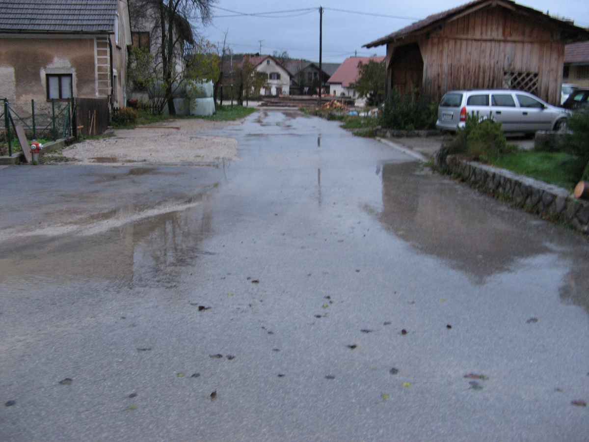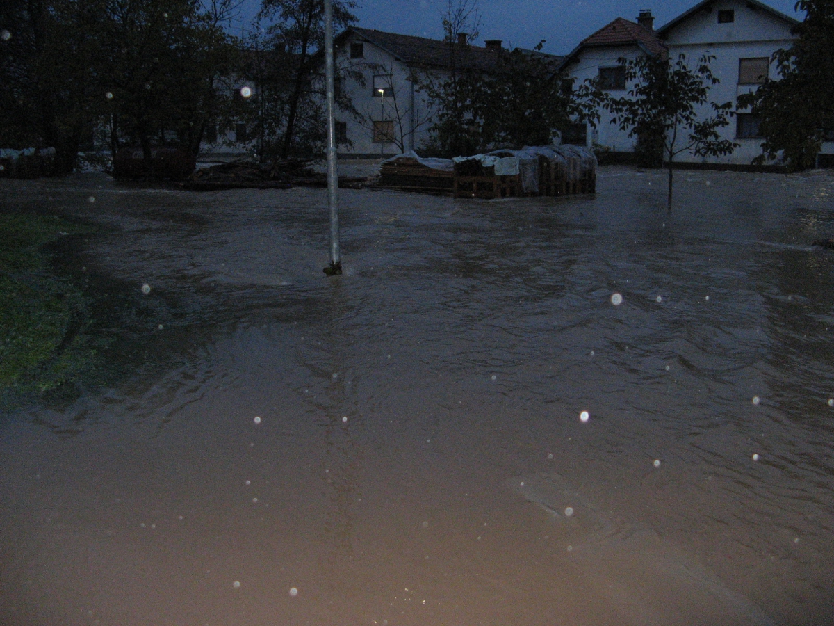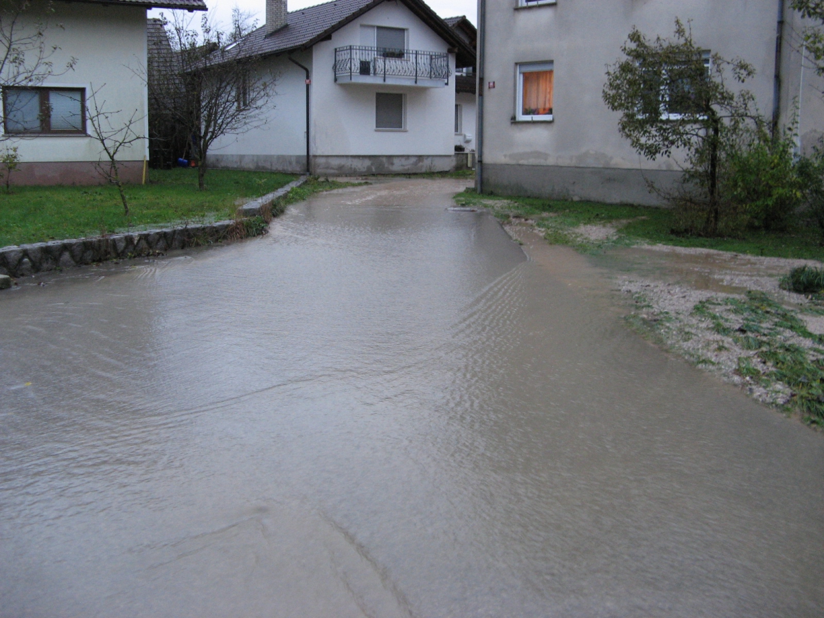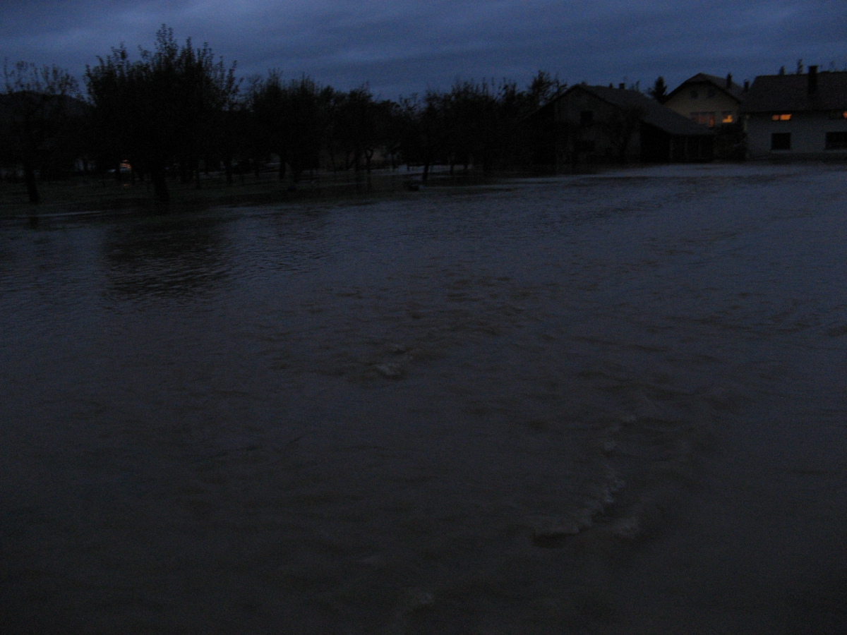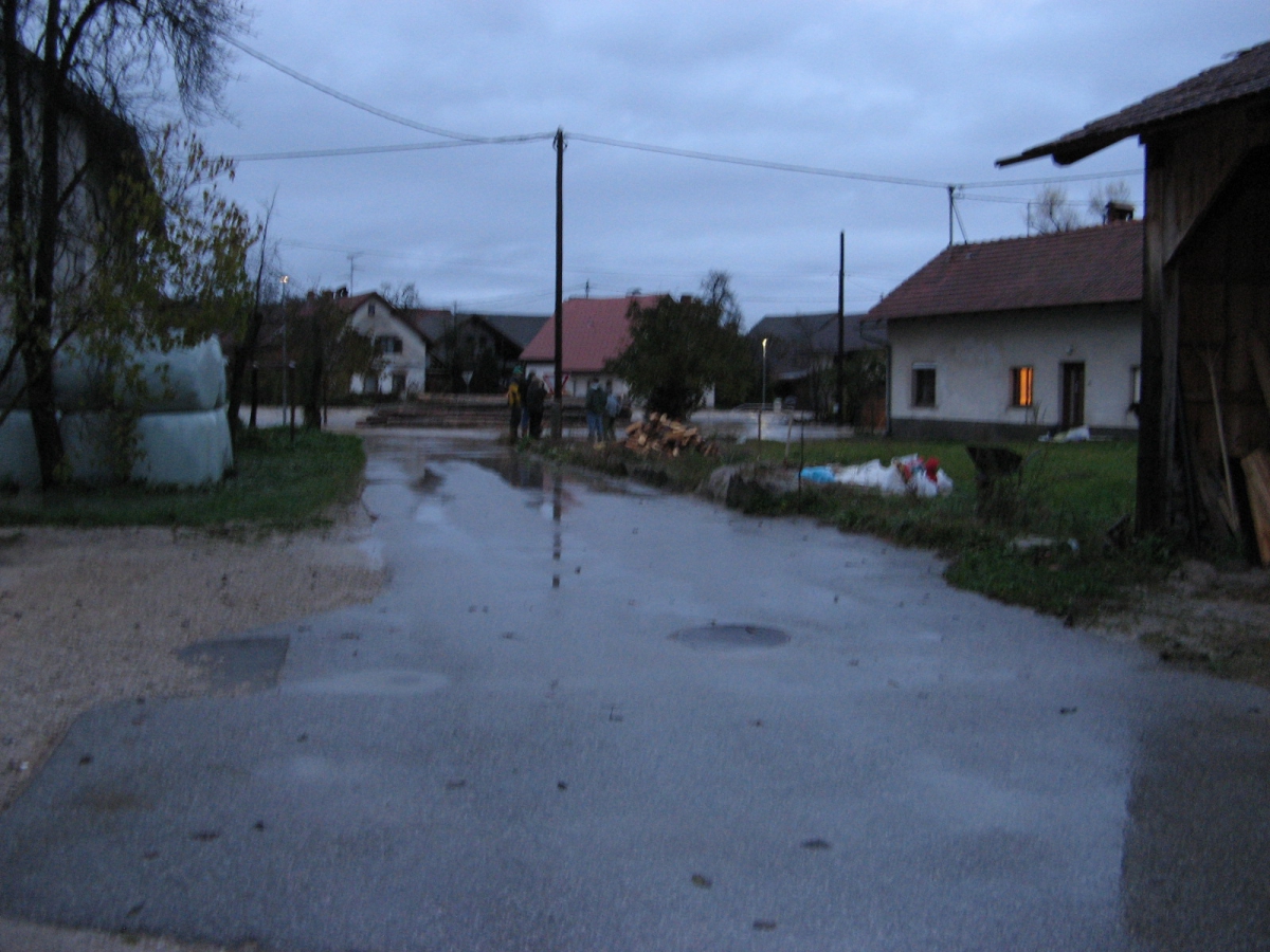 Okoli 6h se je začelo daniti in sem šla pogledat kaj je na njivah, vrtovih, no travnikih konec našega vrta, saj ko je bila noč, sem videla samo to, da je voda do žive meje, ter da je nekje v bližini močno bobnelo. Ko sem prišla ke, sem videla, da se je travnik spremenil v potok, bobnenje pa je povzročal tok, ki se je prelival preko ceste na drugo stran in nadaljeval svojo pot poplavljanja.
