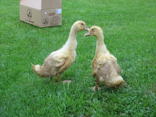Hahaha, ne, ne, ni hahaha, je skoraj ga-ga-ga. Na naše "posestvo" sta prispela dva, no en parček, tak lep, mali, puhasti parček. Ja, ja, še je puhast, pa tak čuden vonj ga obdaja pa puh odpada in zgleda, kot da bi bila gola po enem delu, pa glasu še nimata pravega, pa še toliko malenkosti je okoli njiju, ampak saj bo, saj bo.