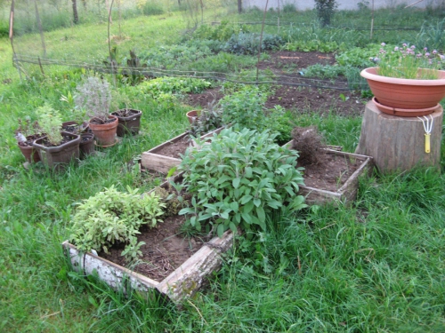 Poleg same gredice imam nekaj začimb tudi poleg nje v lončkih. To so tiste rožice, ki niso prezimne, ali pa so prezimne, vendar si jih ne upam pustiti zunaj čez zimo, saj so navajene na mediteransko okolje. Moram se pohvaliti, da so mi prezimele vse rastline, razen ene mete, ter že jeseni sem ugotovila, da ananasov žajbelj ni prezimen, je pa tako lepo rdeče cvetel, da sem si ga novega kupila letos in tokrat ga bom posadila v lonec. Dve rastlini za kateri nisem bila prepričana ali bosta preživeli ali ne, saj sta bili v obupnem stanju, že suhi pa sta stevia, katera še vedno ni v najboljšem stanju, saj jo sproti pojedo polži in citronka, to je rastlina, ki ima liste z vonjem limone. Zanjo sem resnično mislila, da se mi je posušila, vendar sem jo dala v toplo gredo, kjer sem jo brez vsakega upanja zalivala in pred kratkim sem ugotovila, da poganja listke, čisto vesela, da mi je preživela. Drugič jo moram tudi čez zimo malo bolje zalivat.