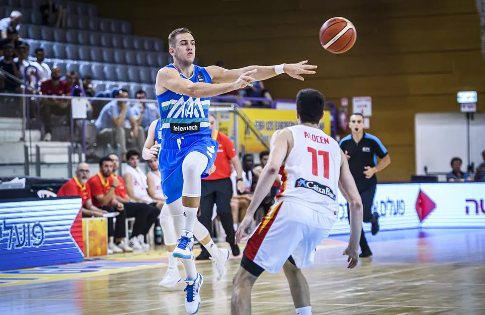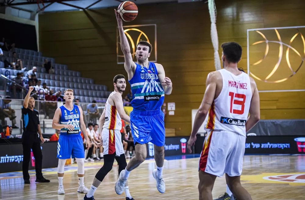 Ekipi sta odločilno tekmo za uvrstitev v četrtfinale začeli z uspešnima metoma za tri točke in kljub temu, da so Španci uvodnih pet minut tekme vodili, so se naši fantje kasneje le prebudili, ujeli zaostanek ter pred začetkom druge četrtine povedli z 19:15. Kot je bilo za pričakovati, so Španci na začetku druge četrtine dvignili ritem igre, z delnim izidom kar 23:2 pobegnili Slovencem, ki so nato do glavnega odmora dosegli le še 6 točk. Najboljša strelca Slovenije Nejc Klavžar in David Kralj tokrat nista bila pri metu in sta v prvem polčasu skupaj dosegla le štiri točke (met iz igre 2/11).