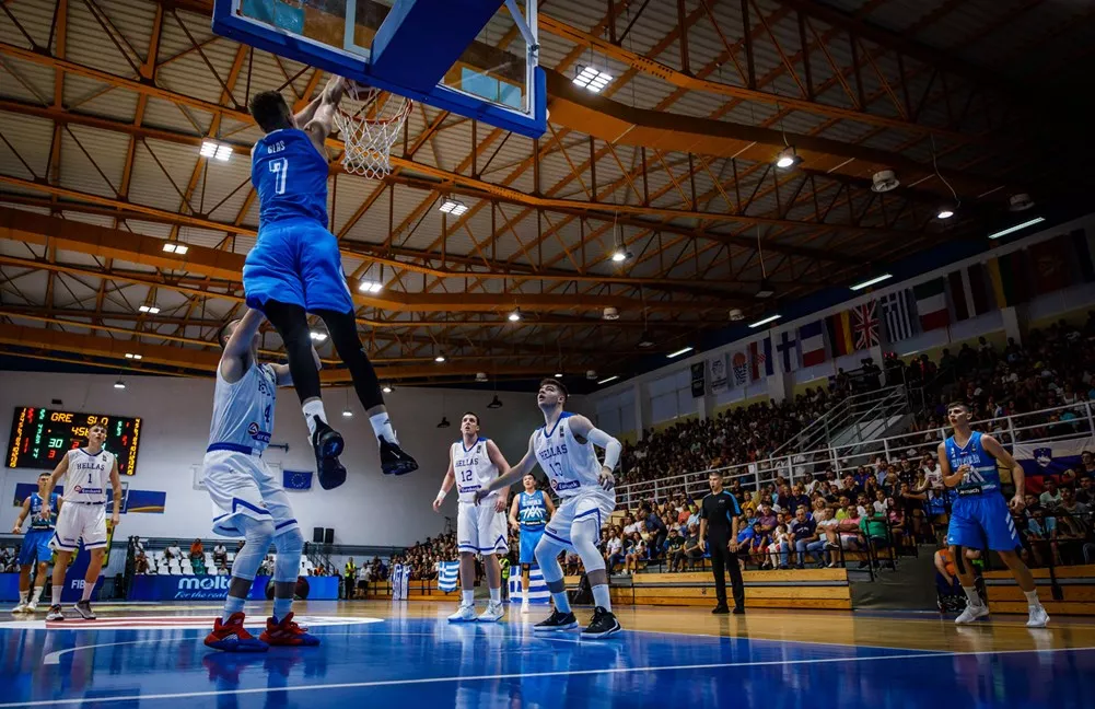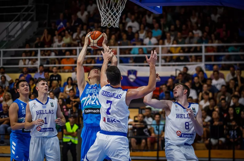 Slovenski košarkarji so v uvodnih minutah zadnje tekme skupinskega dela tekmovanja z delnim izidom 11:2 utišali številčno grško očinstvo, v dvorani pa je bilo slišati le peščico glasnih slovenskih navijačev. Po odličnih prvih treh minutah so naši fantje padli v strelski mrk, Grki pa so počasi in vztrajno nižali razliko. V osmi minuti prve četrtine so domačini prišli do izenačenja ter z uspešnima prostima metoma tudi prvič povedli. Grki so pred začetkom druge četrtine vodili za tri točke (16:19) in po štirih zaporednih točkah Andreasa Kalogirosa povedli s 16:23. Po minuti odmora Slovenije se je igra razživela in košarkarji obeh reprezentanc so prikazali kar nekaj atraktivnih potez. Gregor Glas je po odlični podaji Žige Samarja atraktivno zabil, kar je malce prebudilo slovenske košarkarje, kljub temu, pa so domačini obdržali prednost petih točk ter s posrečenim metom z desetih metrov na glavni odmor odšli z osmimi točkami prednosti (30:38).