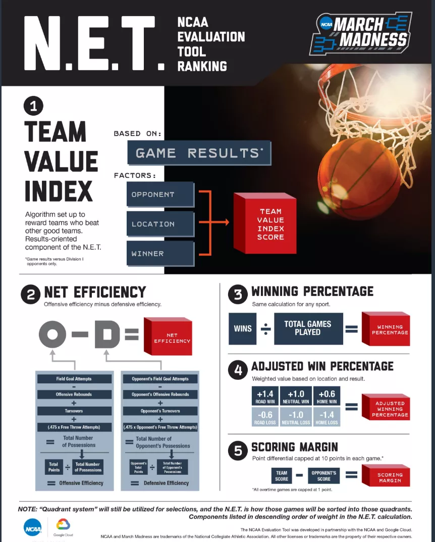 Nam najbolj poznana NCAA 1. divizija je sestavljena iz 32 konferenc, v katerih nastopa 353 univerz. Sezona je sestavljena iz tekem z nasprotniki, ki ne nastopajo v isti konferenci in nato od decembra naprej še liga konference. Vse univerze so borijo za 64 prostih mest na t.i. March Madness. Kdo pa bo tam nastopal pa določajo pravila, ki so milo rečeno zelo zakomplicirana. Da je univerza zagotovo uvrščena na »marčevsko norost« mora osvojiti naslov prvaka svoje konference. Ostalih 32 pa je dodeljenih po algoritmu, ki ga sestavi komite NCAA. Algoritem je sestavljen iz kombinacije ekipnega indeksa, učinkovitosti, procenta zmag, prilagojenega procenta zmag in točkovne razlike na posameznih tekmah.