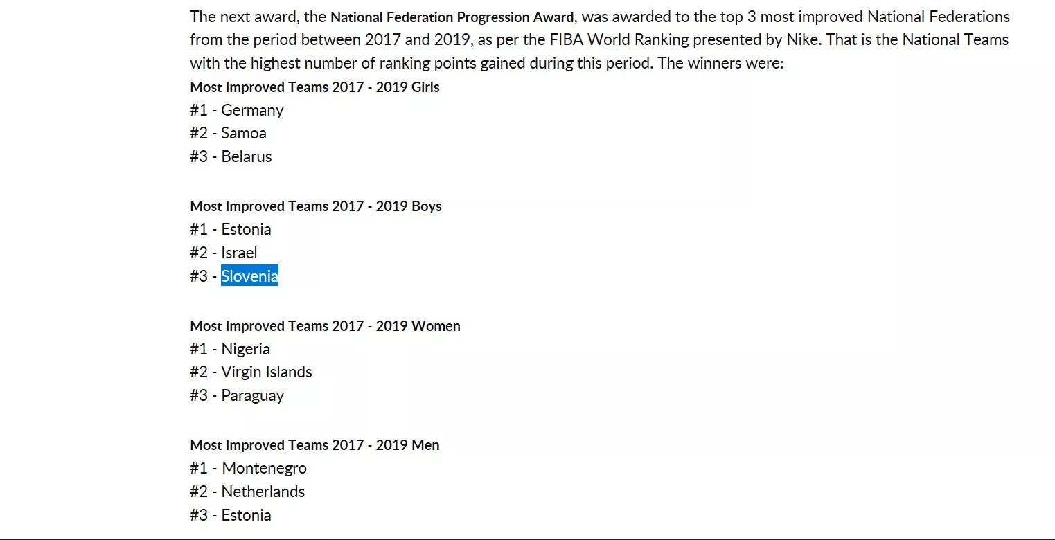 Fiba, svetovna košarkarska zveza, je Slovenijo uvrstila na visoko 3. mesto v konkurenci ekip mlajših fantovskih selekcij. Drugače povedano: slovenske fantovske mlajše selekcije so med letoma 2017 in 2019 naredile tretji največji napredek. Pred nami sta Estonija in Izrael.