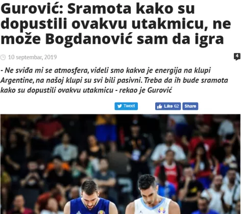 Najbolj ošter do igralcev je bil po tekmi Milan Gurović, nekdanji košarkar, sedaj pa strokovni komentator, ki je na javni televiziji dejal, da bi moralo biti reprezentanco sram po takšni predstavi.