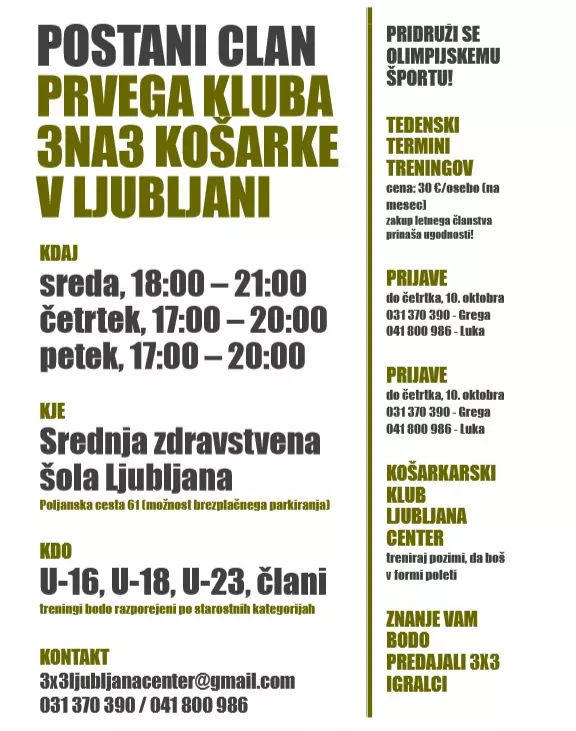 Ponujamo vam kakovostne treninge, kjer boste zagotovo napredovali. Treningi se bodo odvijali vsak teden na Srednji zdravstveni šoli v Ljubljani, mesečna članarina znaša 30 € na osebo, več informacij pa najdete v priloženem letaku. Izkoristite priložnost in postanite del panoge, ki bo prihodnje leto prvič prisotna na olimpijskih igrah na Japonskem, prijave zbiramo do 10. oktobra na elektronskem naslovu 3x3ljubljanacenter@gmail.com!