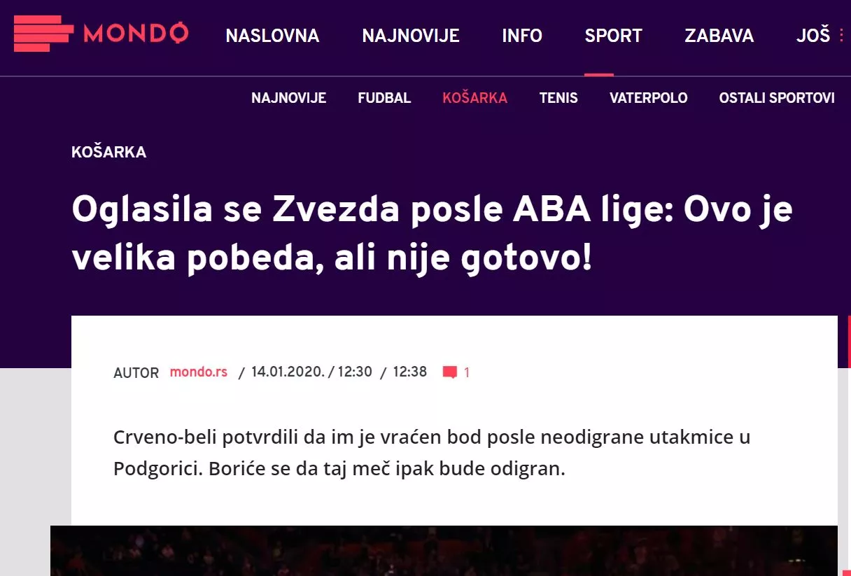 Crvena zvezda, tako so sporočili, iz varnostnih razlogov ni potovala na tekmo 13. kroga Lige ABA. Poslabšanju razmer naj bi botrovala odločitev črnogorskega parlamenta, ki je v noči na 27. december sprejel zakon o svobodi veroizpovedi. Zato bodo morale verske skupnosti po novem dokazati lastništvo verskih objektov, temu so se uprli v pravoslavni cerkvi, po državi je prišlo do številnih protestov.