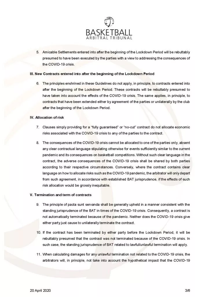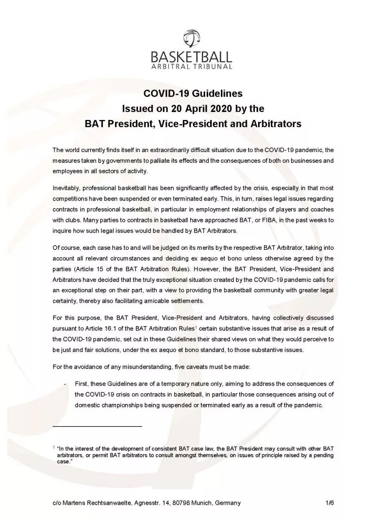 Košarkarsko arbitražno razsodišče (BAT) je sprejelo smernice, ki jih bodo arbitri uporabljali pri reševanju sporov, ki se nanašajo na posledice pandemije Covid-19, v svojem tokratnem zapisu na blogu piše specialist za športno pravo Blaž Bolcar.