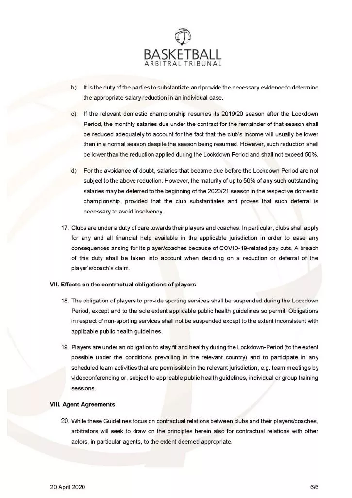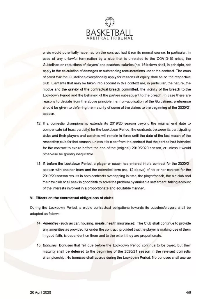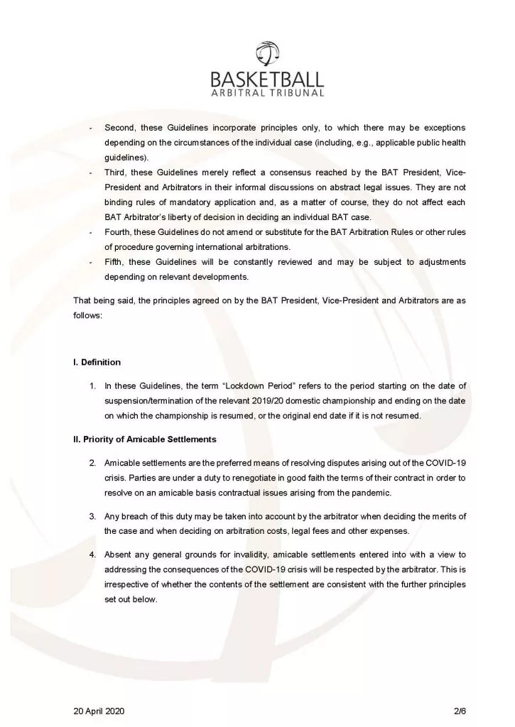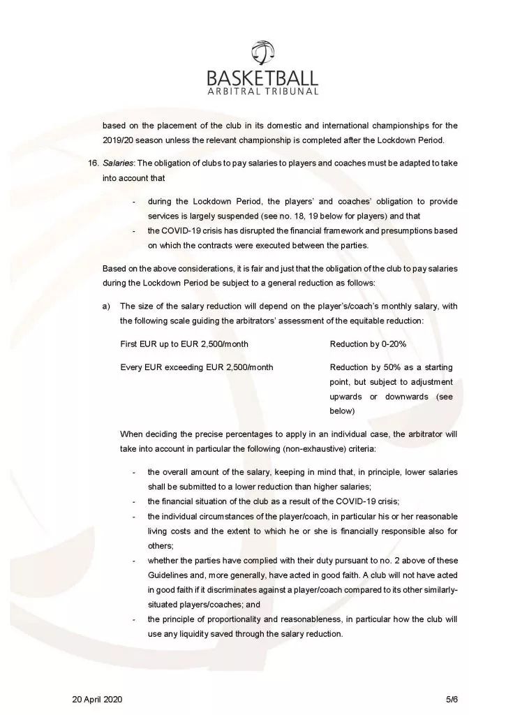 Potrebno je poudariti, da ne gre za toga navodila, temveč smernice, ki se bodo smiselno uporabljale od primera do primera. Na podlagi slednjih je mogoče zaključiti, da je praksa klubov, ki so igralcem prekinili pogodbe oziroma jim na obdobje po zaključku lige ne bodo izplačali nikakršnega plačila, nezakonita. BAT izpostavlja tudi predlog oziroma priporočilo, da naj se igralcem z nižjimi pogodbenimi zneski (do 2.500 EUR) plačilo zniža manj, kot tistim z višjimi zneski. Klubi, ki uveljavljajo znižanje plačil, bodo morali ustrezno dokazati, da je takšno znižanje utemeljeno in predvsem sorazmerno.