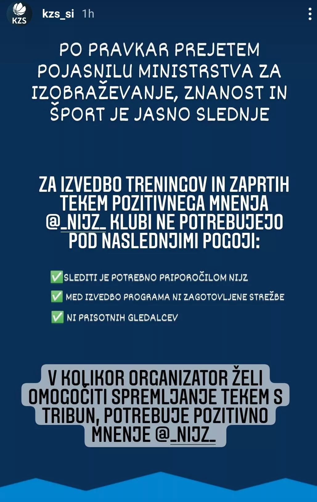 V kolikor želi klub organizirati tekmo s prisotnostjo gledalcev potrebuje soglasje NIJZ (v kolikor ga še nima), v kolikor pa bo klub organiziral tekmo brez gledalcev soglasja NIJZ ne potrebuje, prav tako ne potrebuje soglasja za izvedbo treningov v kolikor so treningi zaprti in na njih vstopa nimajo druge osebe razen tiste, ki morajo biti na treningu prisotne.