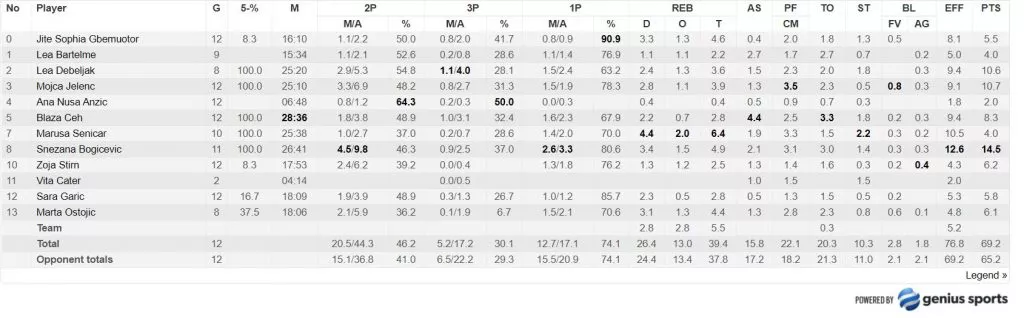Maruša Seničar je vodilna pri skoku (6.4) in pridobljenih žogah (2.2)