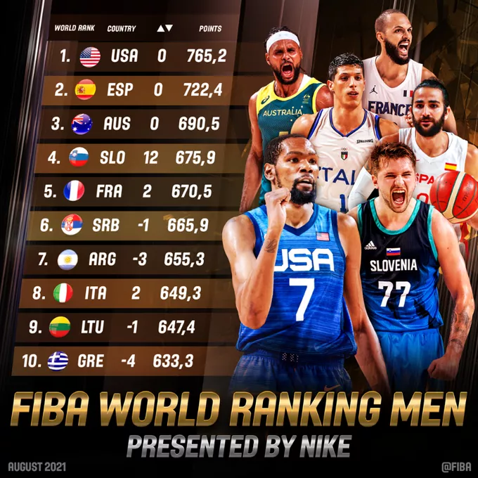 Mednarodna košarkarska zveza FIBA je po koncu olimpijskega turnirja objavila posodobljeno lestvico. Slovenski košarkarji so s 16. mesta skočili na četrto. Pred njimi so le ZDA, Španija in Avstralija.