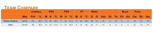 Petrol Olimpija: Jones 9 (8 skokov), Špan 12 (4 podaje), Bubnić 4, Lazić 16 (12 skokov), Šamanić 6 (6 skokov), Simonović, Begić 8, Badžim 9 (4 podaje), Mesiček, Sanon 3 (4 skoki), Rebec 3, Kastrati.