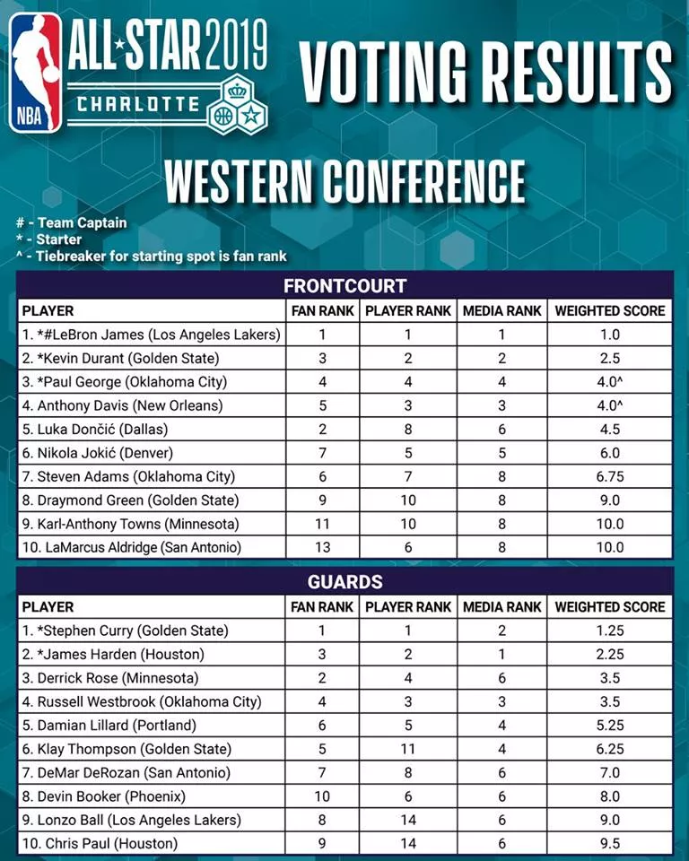Igralci: 1. mesto: LeBron James - 174 glasov, 2. mesto: Kevin Durant - 168, 3. mesto: Anthony Davis - 136, 4. mesto: Paul George - 76, 5. mesto: Nikola Jokić - 75, 6. mesto: LaMarcus Aldridge - 49, 7. mesto: Steve Adams - 48, 8. mesto: Luka Dončić - 43 ...
