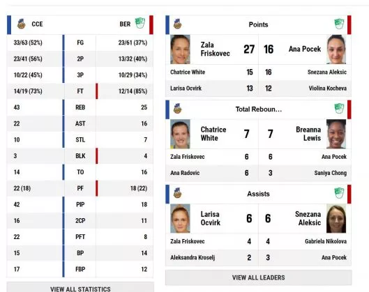 ŽKK Cinkarna Celje: Friškovec 27 (6 skokov, 4 podaje), Ocvirk 13 (5 skokov, 6 podaj), Delić 8, Bessard 12 (4 skoki), White 15 (7 skokov), Krošelj 7, Seničar 2, Radović 6 (6 skokov).