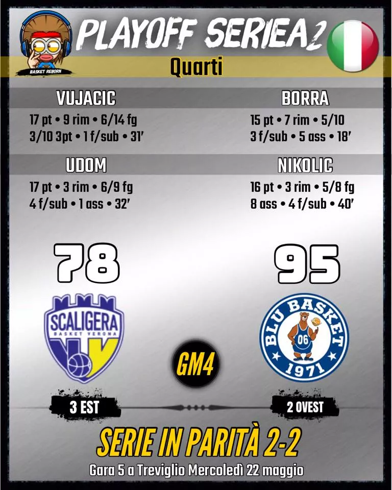 Nadaljuje se tudi končnica v 2. italijanski ligi, kjer se za napredovanje borita Verona in Blu Basket, za prve igra Saša Vujačić, za druge pa Mitja Nikolić, po štirih tekmah četrtfinala je rezultat 2:2 v zmagah!