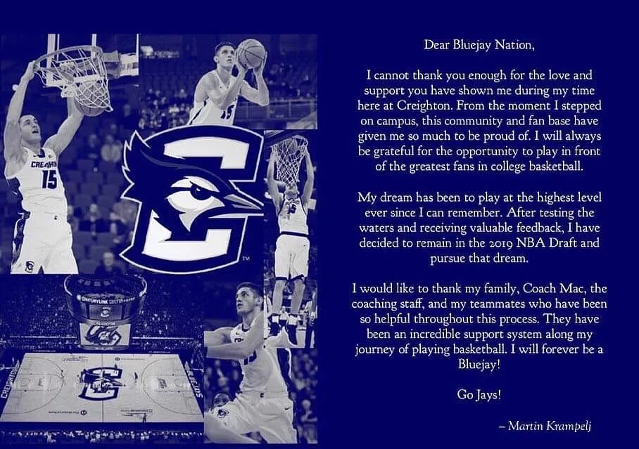 Benjamin Stevic, agent of Creighton's Martin Krampelj, informed ESPN his client will forgo returning to college and will keep his name in the Draft. The athletic 24-year old junior big man was an all-conference player in the Big East. Will have plenty of pro options this summer.